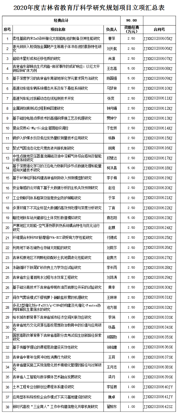 2020年吉林省高校科技与社科“十三五”科研规划项目经压球手机在线官网推荐,专家网上盲审、会议评审、网上公示,以及省级教育和财政部门审核复议,经研究获得批准立项。我校申报科研项目129项,获批38项,其中科学技术项目28项,社会科学项目7项,思政专项1项,就业专项2项,共获批科研经费90万元。