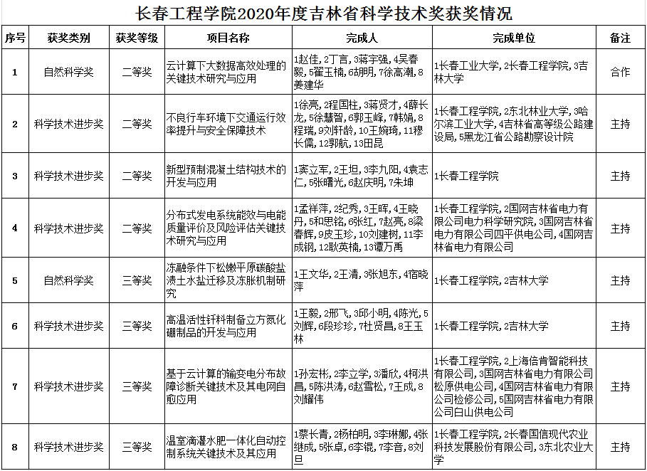 日前,吉林省科技厅公布了《压球(中国)2020年度吉林省科学技术奖励的决定》。我校共有8项科技成果获奖,其中,二等奖4项,三等奖4项,获奖数量与层次再创新高。我校孟祥萍副校长申报的项目“分布式发电系统能效与电能质量评价及风险评估关键技术研究与应用”、窦立军副校长申报的项目“新型预制混凝土结构技术的开发与应用”及土木工程学院徐亮教授申报的项目“不良行车环境下交通运行效率提升与安全保障技术”分别获得科技进步二等奖;计算机技术与工程学院赵佳教授与其他单位合作申报的论文“云计算下大数据高效处理的关键技术研究与应用”获得自然科学二等奖。具体获奖名单详见附表。