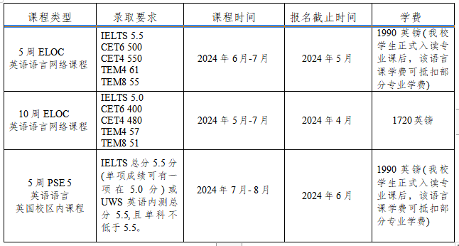 西苏格兰大学为英语语言水平未满足学位要求的学生开设英语语言网络课程班(ELOC)以及英国校区内5周英语语言提高班(PEC5),具体录取要求及费用情况如下: