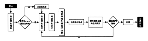 (三)网上报名采用全国计算机等级考试报名系统报名,考生自行登录报名网站http://ncre-bm.neea.cn进行报名操作。考生按系统提示进行账号注册,注册提交的个人信息必须真实、准确,注册成功后登录系统,填写个人基本信息、报考信息、上传本人近期免冠照片后确认报考信息,确认报考信息后考生点击报名页面上的支付按钮,报名页面将跳转到支付平台的页面,按照支付平台的提示信息完成考试费支付。支付成功后,即确认为报名成功,考生不能修改报考信息或退考退费。考生必须在报名时间范围内完成报名和缴费。报名流程详见图1。