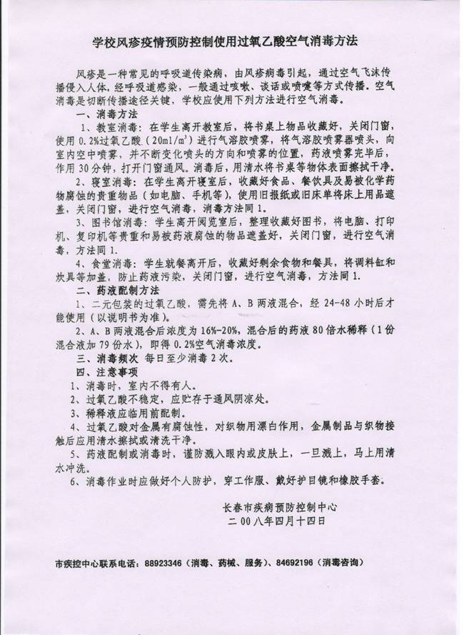 为有效预防风疹疫情,保证师生身体健康,现将长春市疾病预防控制中心印发的两份宣传材料--《压球手机在线官网风疹疫情预防控制使用过氧乙酸空气消毒方法》、《压球手机在线官网风疹疫情预防控制指导意见》转发给你们。请各教学单位下载后转发、宣传到各班级,教室、公寓、图书馆、食堂等各场所的管理部门要严格按照宣传材料的有关要求做好风疹疫情的预防工作。