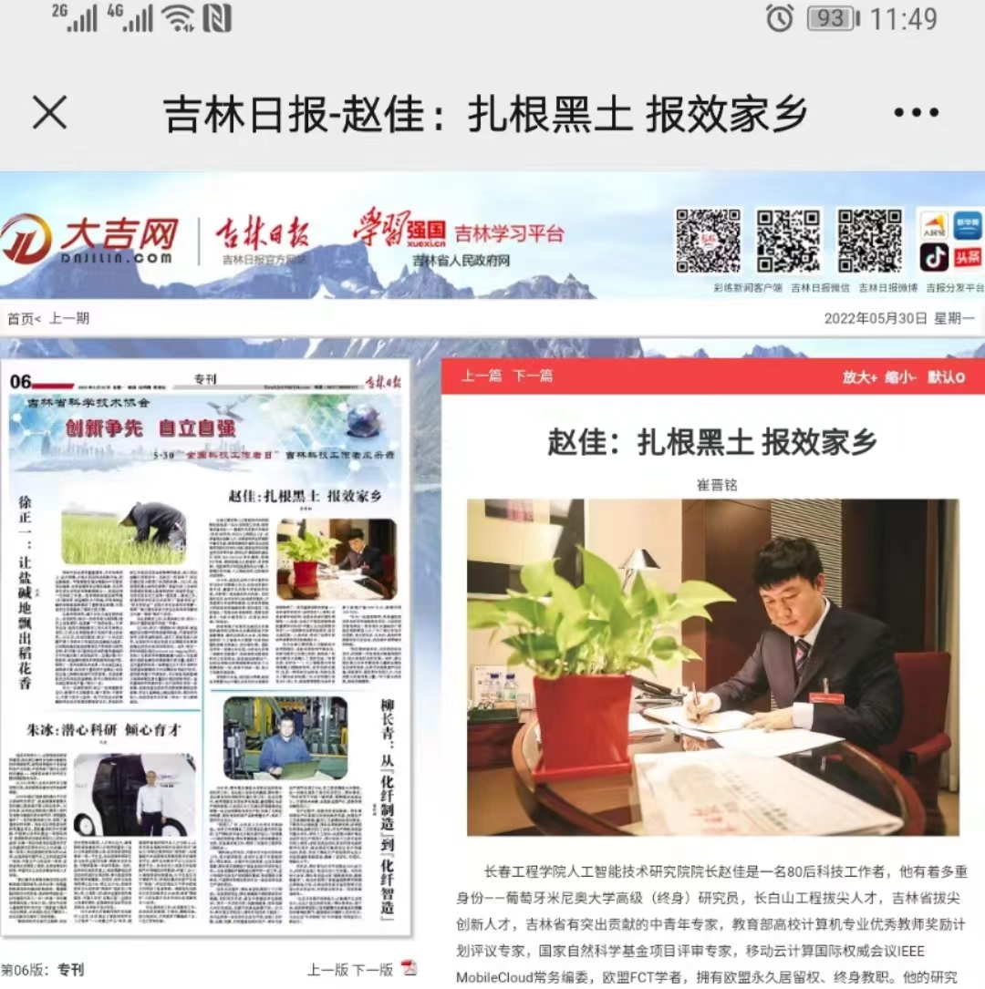 2013年,赵佳从吉林大学计算机科学与技术学院博士毕业,先后在英国牛津大学、葡萄牙米尼奥大学做研究学者,并取得了相当高的学术成就。然而海外的生活并没有让赵佳感到踏实,尤其是黄大年老师的事迹,让身处异国他乡的赵佳深深地感动着,更加坚定了他的信念,“我是吉林省培养的,我要回到家乡,为家乡建设助力,实现自身价值。”赵佳说。赵佳拒绝了沿海发达地区众多高校和高科技互联网企业提供的房产和高薪聘请,毅然回到故乡吉林,率领他组织的“人工智能与大数据”专家科研团队深植吉林黑土,在长春扎根。团队当中有一些博士毕业后,已经在北京等一线城市安家落户、有的享有出国或在机关工作的机会,但在赵佳的感召下,这些志同道合的领域精英纷纷放下已经拥有的一切,投身于科研一线,致力于创新发展实践。短短的几年里,经过努力拼搏,赵佳在大数据与云计算以及学科交叉等诸多领域取得了一系列重要成果和荣誉——吉林省科学技术(自然科学)二等奖;吉林省青年科技奖,也是吉林省计算机领域唯一入选者;当选了中国区块链领域的重要学术机构“中国工业与应用数学学会”——区块链专业委员会委员,是东北地区唯一入选专家,得到了各界对其研究成果和学术的高度认可。作为压球手机在线官网人工智能技术研究院院长,当被问到如何平衡生活、科研与教学三方面工作时,赵佳说:“科研与教学已经融入了我的生活,‘有教无类、知行合一’。人工智能是为传统领域插上翅膀的学科,在求知的过程中,也是一种科研生活状态,科研也是为了解决实际问题。”2019年归国以来至2021年4月,赵佳带领团队为吉林省累计新增产值7598万元,新增利润1767万元。“作为一名高校教师,我希望把我的所见所学传递给我的学生,为吉林的发展培养出一批具有扎实基础和广阔适应性的新型人才。”为了能让学生开拓视野,真正学知识、长见识,赵佳时常鼓励学生们走出去,在实践中获得真知和技能。“我们要发展科技,并应用好这些技术,利用新一代信息技术赋能传统行业,助力其他行业的发展。同时,要从服务第三方向依靠自身力量的全链条自主研发转变,这样不仅能提高产业价值,还能吸引、留住更多优秀人才,为吉林振兴发展贡献力量。”对于家乡的发展,赵佳充满期待。