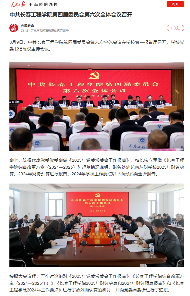 人民日报、吉林日报、今日头条等多家媒体报道我校第四届委员会第六次全体会议