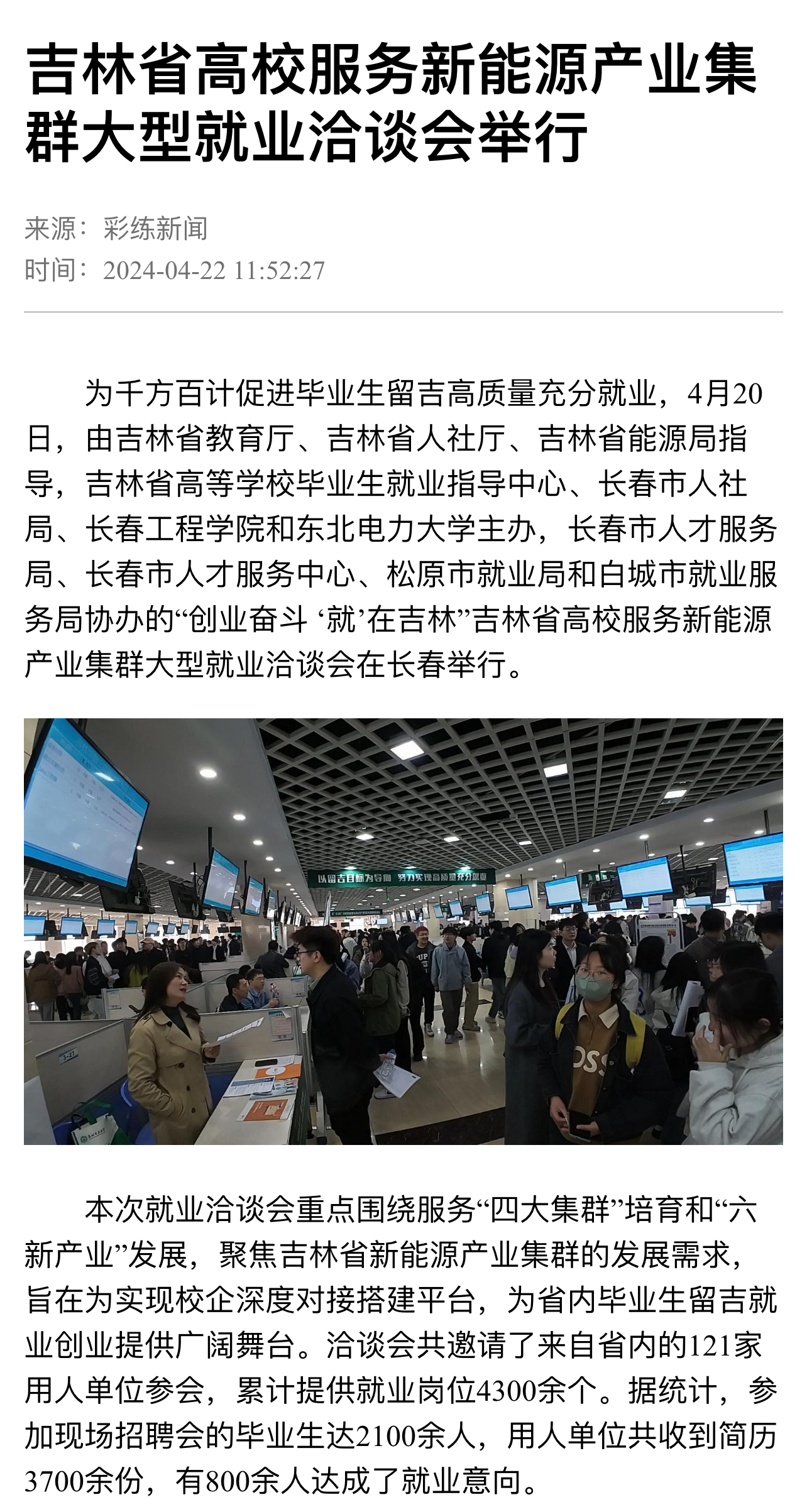 人民日报、彩练新闻、今日头条等多家媒体报道我校与多家单位联合主办的吉林省高校服务新能源产业集群大型就业洽谈会