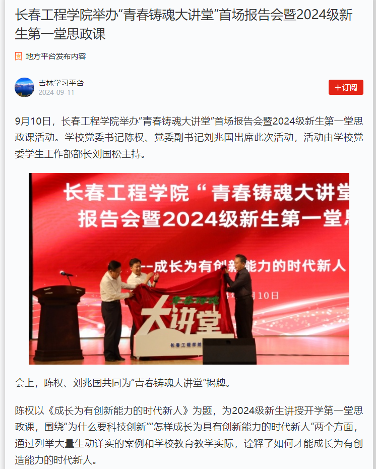 学习强国等媒体平台报道我校“青春铸魂大讲堂”首场报告会暨2024级新生第一堂思政课