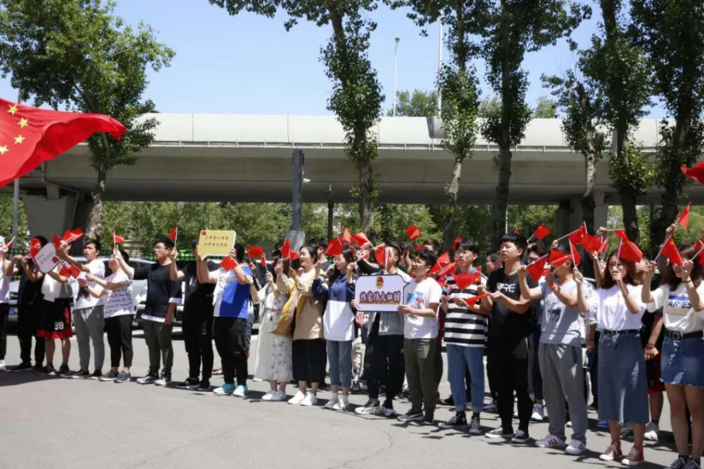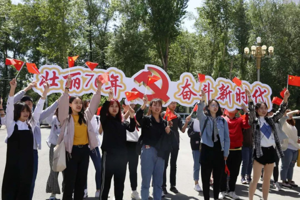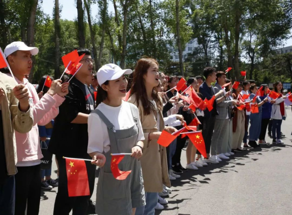 悠扬的歌声回荡在校园里,手中的红旗闪动,形成了一道靓丽的风景线。