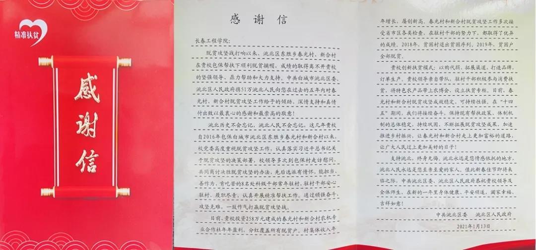 2021年,中共洮北区委、洮北区人民政府又给压球手机在线官网发来了感谢信。“有情怀、能担当、善作为、肯吃苦”,信中这样形容压球手机在线官网的驻村干部;“洮北永远是您情感依托的地方,洮北人民永远是您至亲至爱的家人”,信中这样形容双方的帮扶关系。
